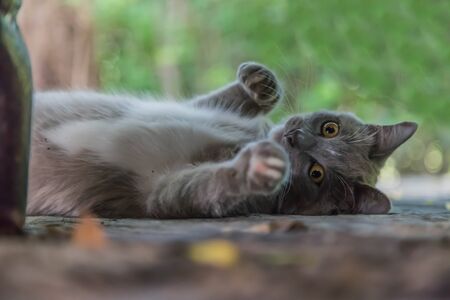 Kitten fighter. The cat threatens his gaze and fist paws like a boxer.