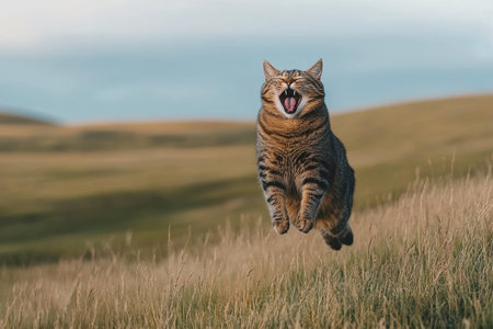 A charming scene of a sleepy cat yawning midair as it jumps above a sunny field, surrounded by soft grass. This delightful image captures playful serenity.