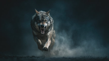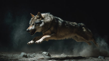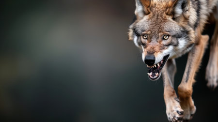 This dramatic image showcases a wild coyote in an action pose, highlighting its fierce expression and agile movement in a natural setting.