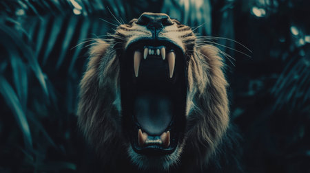 A close-up view of a majestic lion roaring in a lush jungle, showcasing its fierce expression and powerful presence amidst the vibrant greenery of its habitat.
