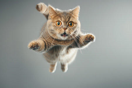 Cute british cat in flight indoor, face of jumping pet on blurred gray background. Portrait of funny flying domestic animal. Concept of humor, play, energy, hunt. Generative AI