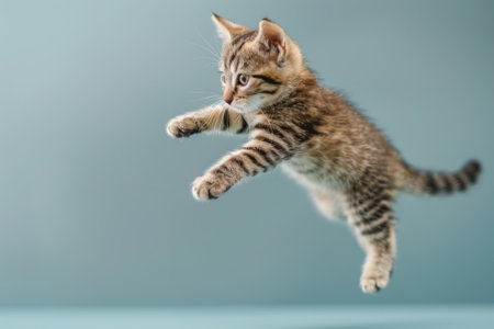 American Shorthair cat Jumping and remaining in mid-air, studio lighting, isolated on pastel background, stock photographic style