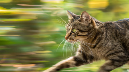 Gray Tabby Cat Racing Across Autumn Yard. Concept of feline agility, outdoor playtime, seasonal beauty, pet energy, fast running, motion.