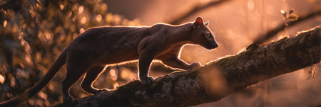 A fossa gracefully navigates a tree branch against a vibrant sunset, showing its agility and the beauty of nature during twilight hours.