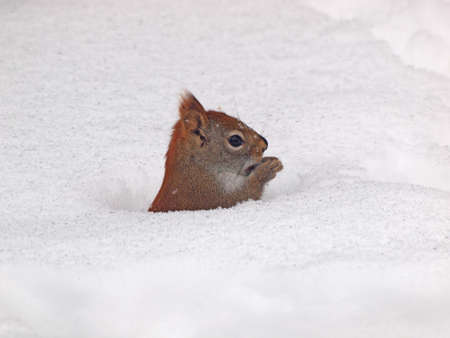 Adorable American red squirrel is peaking out from the tunnel under snow and watching around.