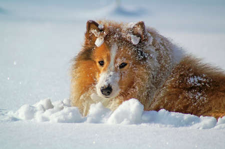 A playful Shetland Sheepdog playing in deep snow a beautiful winter day