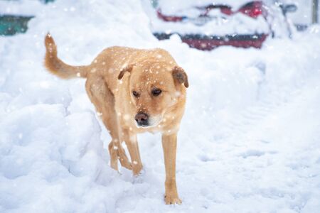 Frozen stray dog standing in the snow in winter