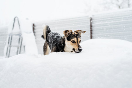 Winter leisure. Pet care. Adorable mixed breed dog playing in the snow in the backyard
