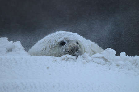 Gray Seal (Halichoerus grypus) pup in winter, snowstorm, Helgoland