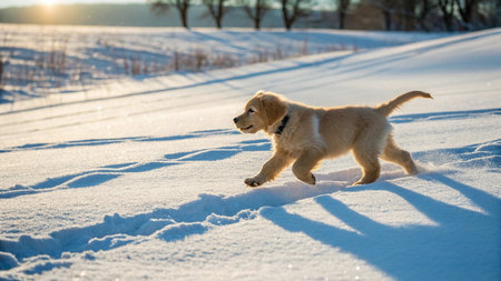 Golden Retriever puppy running in the snow on a sunny winter day