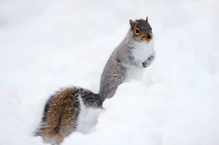 Squirrel closeup with white snow in winter from Central Park in New York City Manhattan.
