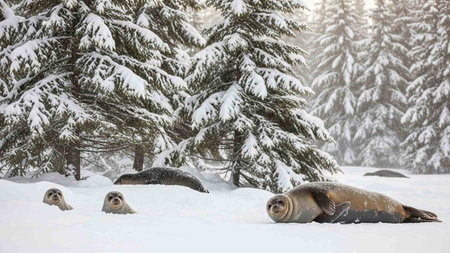 A group of seals rest in a snowy forest, surrounded by snow-covered evergreen trees, showing a serene winter scene with wildlife in their natural habitat.
