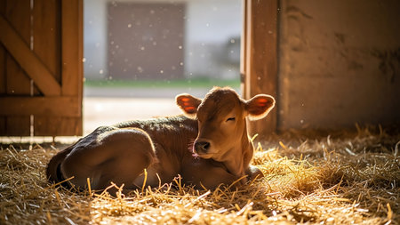 Cute brown calf lying on the straw in the stable, sunny day