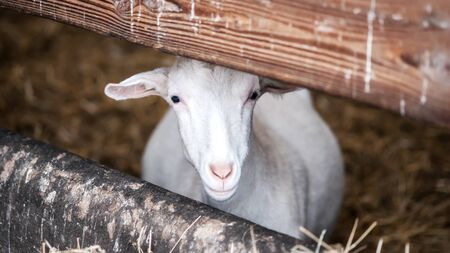 Adorable white goat without horns stands in a barn. Beautiful well-groomed animals