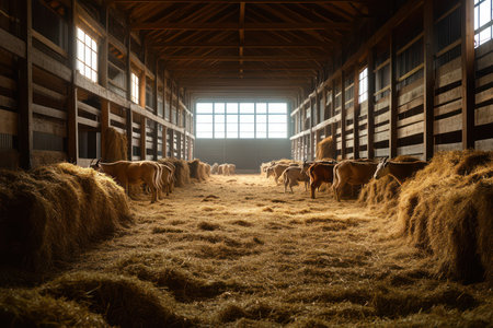 The first rays of dawn stream through a rustic wooden barn, illuminating the golden hay scattered across the floor. The warm, hopeful light fills the empty space, promising a new day of peace and quiet productivity on the farm.