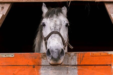 close-up portrait of a white, gray chestnut horse standing at the horse farm looking out the window in its stable