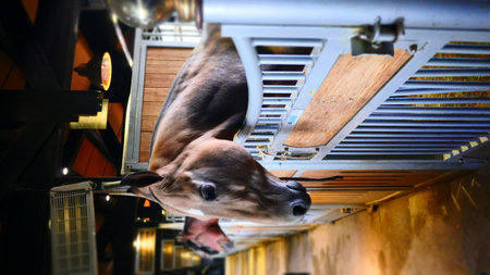 Group of goats inside barn eating hay, showing daily farming life and animal husbandry practices in agricultural environments.