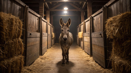A donkey in a dimly lit barn hallway lined with hay capturing a serene farm environment