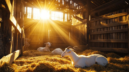 A cozy barn interior with goats lying on fresh hay, sunlight streaming through the wooden slats.