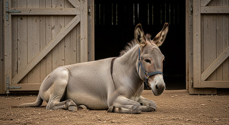 Donkey lying on the ground in the corral of the barn