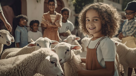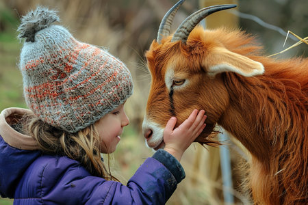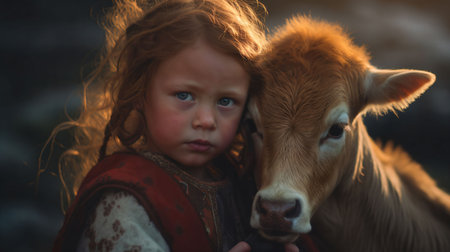 An AI generated illustration of a young child holding a brown cow