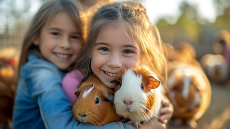 Child with braided hair, dressed in a cozy pink sweater, lovingly embraces a fluffy rabbit, creating a delightful scene of companionship and warmth, AI generated