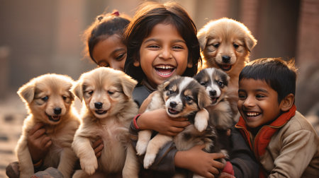 group of children playing with a litter of adorable puppies, all of them grinning from ear to ear.