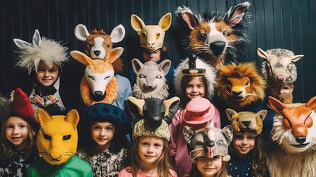 Group of children with animal heads.