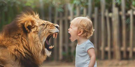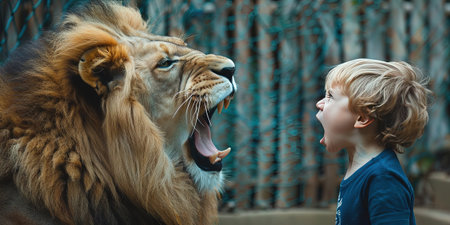 Portrait of a boy and a lion in a zoo. Selective focus.