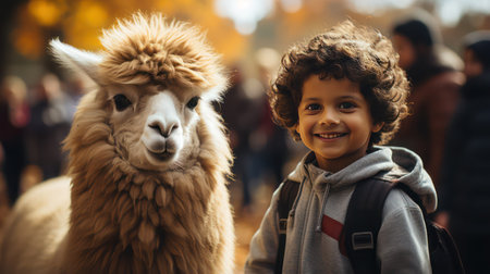 Portrait of a cute little boy with alpaca in the park