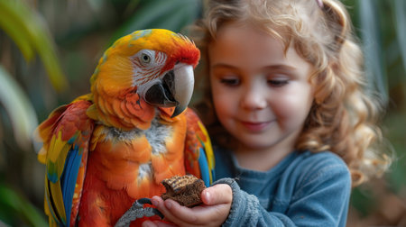 A boy and girl observing a parrot eating from their hands, amazed expressions, colorful feathers of the bird visible.