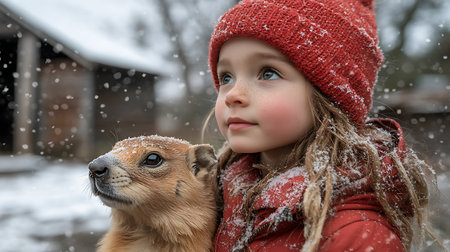 Generative AI Image of Russian Little Girl Carrying Groundhog Predict Winter Weather
