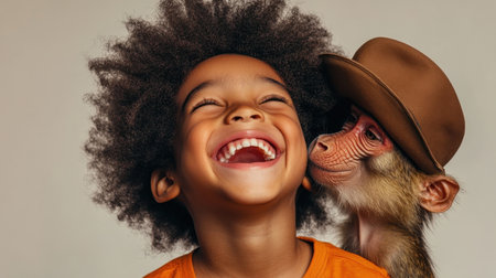 A young boy with curly hair laughs joyfully while a monkey playfully leans in close, both sharing a delightful moment indoors. Bright colors enhance the cheerful atmosphere.