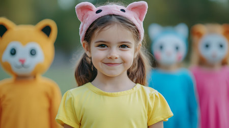 A young girl in a yellow shirt smiles brightly, wearing a pink pig hat. Others in costumes stand behind her, creating a cheerful atmosphere in a vibrant outdoor setting.