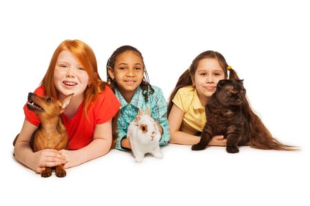 Happy three girls and their different pets playing together isolated on white