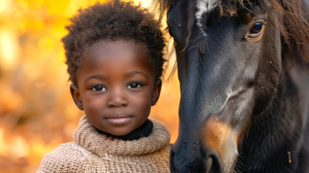 African American girl with a pony in an autumn landscape. Concept of child with animals, nature, friendship, outdoor activities, kid and little horse.