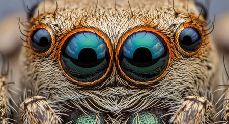 Macro shot of a jumping spider with big blue eyes. Macro