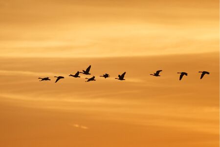Silhouette of a group of ducks and geese flying in the orange sky of a winter day in the Lagunas de Villafáfila Natural Reserve in Spain.