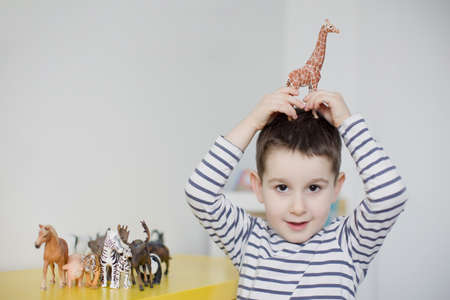 Kid playing with animal toys on colorful mat. Child enjoying educational game. Early childhood development and learning concept.