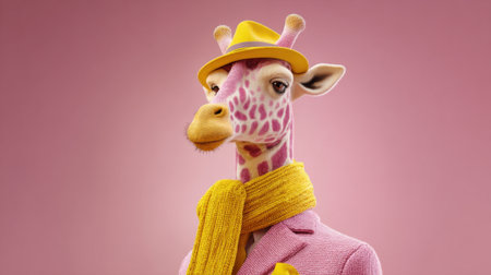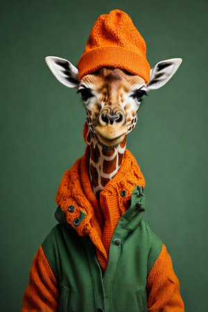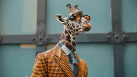 Giraffe in a fashion designer's suit reviewing runway models