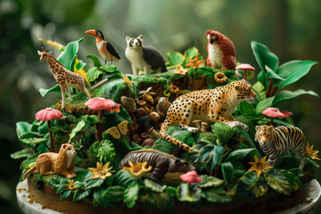 A jungle-themed celebration cake, richly decorated with edible animal figurines and tropical foliage, perfect for a themed party.
