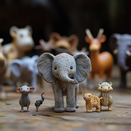 A charming collection of colorful miniature animal figures includes an adorable elephant, a playful mouse, and a cute lion. Perfect for decor or play.