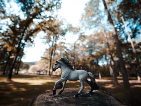 group of toy horses on white background out of focus