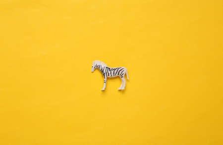 Zebra figurine on yellow background. top view