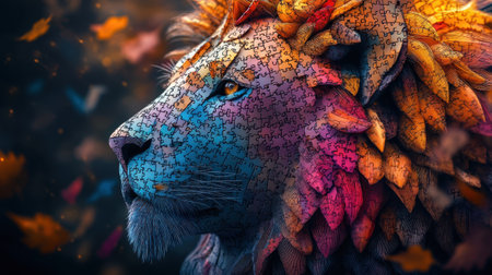 A majestic lion displays a vibrant coat of colors reminiscent of autumn foliage, enhancing the serene beauty of its surroundings. The intricate patterns evoke a sense of wonder and creativity in nature, capturing attention.