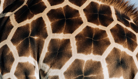 Close-up view of a giraffe's fur reveals intricate hexagonal patterns under natural light. The unique textures highlight the beauty of wildlife in their habitat during daylight.