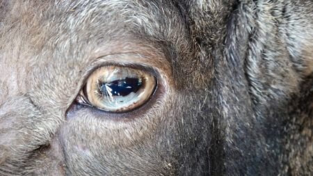 Closeup of eye of donkey in a meadow, Vision concept, macro of brown donkey eye