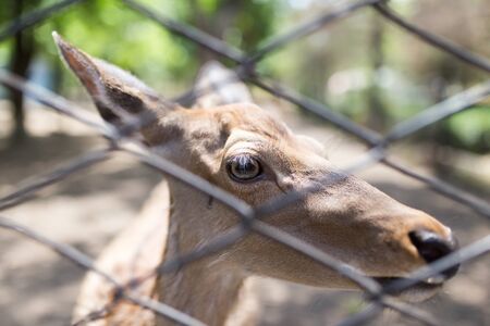 close-up of deer. Roe deer looking directly into the chamber with small horns in the forest sunlit.
