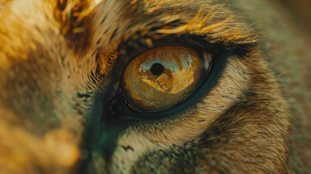 An extreme macro photograph capturing the intricate details of a goats golden-brown eye. The horizontal pupil reflects the world, offering a unique perspective on animal vision, natures complexity, and the raw intensity of the wild.