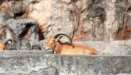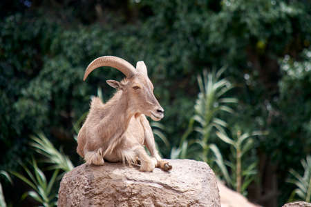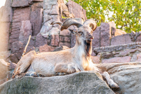 Barbary sheep wild goat antelope lying resting on rocks during hot summer day. One wild Texas aoudad goat with large curvy horns outdoor in savanna park.
